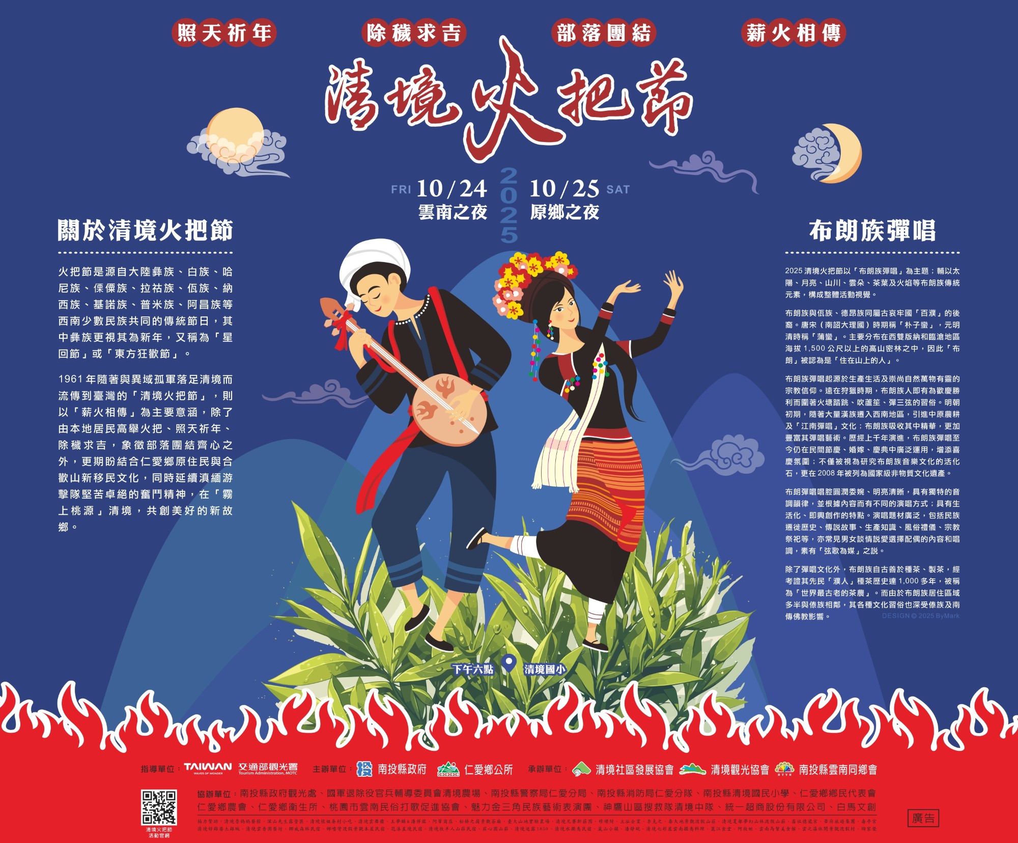 2025清境火把節以「布朗族彈唱」為主題;輔以太陽、月亮、山川、雲朵、茶葉及火焰等布朗族傳統元素,構成整體活動視覺。